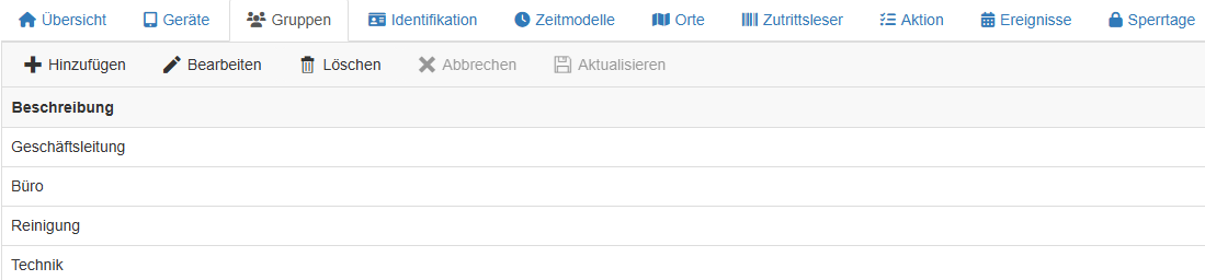 Die Zutrittsberechtigungen erfolgen jeweils gruppenweise. Das bedeutet, dass für jeden Sicherheitsbereich eigene Gruppe anlegen werden können. Dabei können jedem Mitarbeitenden über den Reiter "Personal" mehrere Gruppen zuweisen werden.