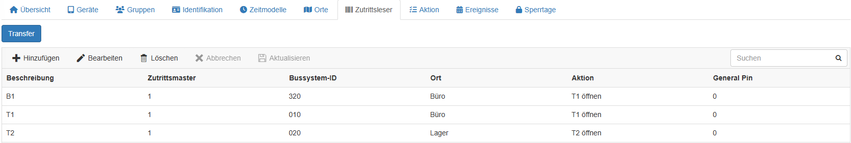 In der Tabelle Zutrittsleser muss jedes Gerät der Zutrittskontrolle eingetragen werden. Die Tabelle gibt dabei an, wie die Einzelnen Geräte der Zutrittskontrolle miteinander verbunden sind. Die Einstellungen "Zutrittsmaster" und "Bussystem-ID" müssen nur einmalig beim Errichten der Anlage angegeben werden.