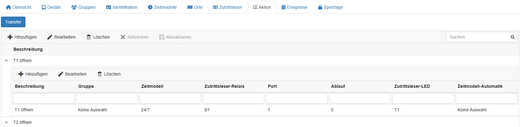 Die Aktionstabelle legt fest, welche Aktionen an einem Leser bei einer erfolgreichen Zutrittsbuchung ausgelöst werden sollen. Ähnlich wie bei der Orte-Tabelle gibt es eine Ober-Struktur mit untergeordneten Elementen. Jedem Leser kann nur eine Ober-Aktion zugewiesen werden. Jeder Ober-Aktion können beliebig viele Unter-Aktionen zugeordnet werden, die bei erfolgreicher Buchung alle gleichzeitig ausgeführt werden (unter Berücksichtigung des jeweiligen Zeitmodells und der angegebenen Gruppe).