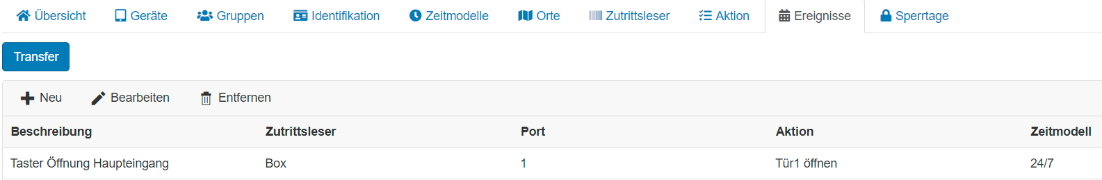 Mit dieser Tabelle kann eine zuvor definierte Aktion durch ein elektrisches Signal an einem ZK-Gerät ausgelöst werden.