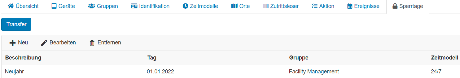 In dieser Tabelle können einzelne Sperrtage definiert werden, an denen kein Zutritt gewährt werden soll (z.B. an Feiertagen).