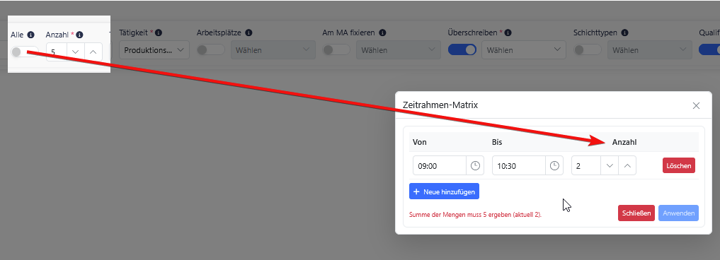 Die Summe aller Zeitfenster muss exakt der im Eintrag definierten Anzahl entsprechen.