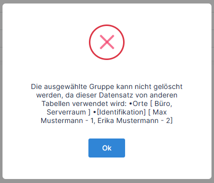 Eine Gruppe kann erst dann gelöscht werden, wenn sie im System nicht länger verwendet wird. Wird das Löschen dennoch versucht, erscheint eine Fehlermeldung mit dem Hinweis darauf in welchen Tabellen die Gruppe noch verwendet wird: